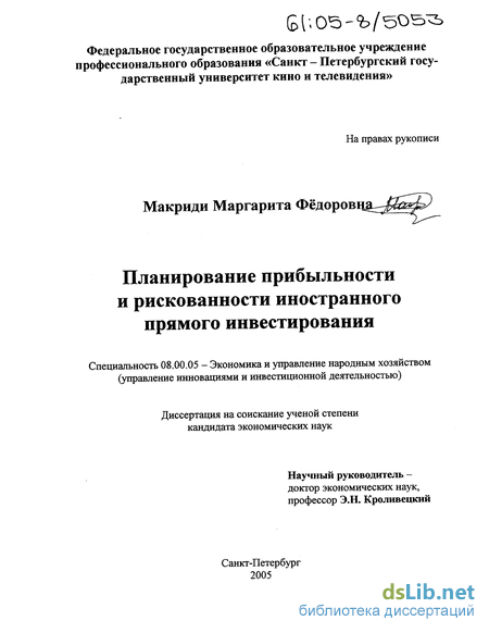 разработать методические подходы к рационализации взаимодействия элементов механизма планирования прибыльности и степени рискованности прямых иностранных инвестиций;