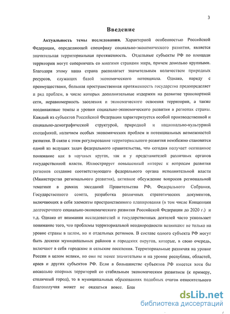 Актуальность темы исследования. Характерной особенностью Российской Федерации, определяющей специфику социально-экономического развития, является значительная территориальная протяженность. Отдельные субъекты РФ по площади территории могут соперничать со многими странами мира, причем довольно крупными. Благодаря этому наша страна располагает значительным количеством природных ресурсов, служащих базой экономического потенциала. Однако, наряду с преимуществами, большая пространственная протяженность государства предопределяет и ряд проблем, в числе которых дополнительные издержки на развитие транспортной сети, неравномерность заселения и экономического освоения территории, а также неодинаковые темпы и уровни социально-экономического развития в регионах страны. Каждый из субъектов Российской Федерации характеризуется особой производственной и социально-демографической структурой, природной и национально-культурной спецификой, наличием особых экономических проблем и потенциальных возможностей развития. В связи с этим регулирование территориального развития неизбежно становится одной из ведущих задач федерального правительства, что сегодня получает осознанное понимание как в научных кругах, так и у представителей различных органов государственной власти. Иллюстрирует повышенный интерес к вопросам развития регионов создание соответствующего федерального органа исполнительной власти (Министерства регионального развития), активное обсуждение вопросов региональной тематики в рамках заседаний Правительства РФ, Федерального Собрания, Государственного совета, разработка различных стратегических документов, включающих в себя элементы пространственного планирования (в том числе Концепции долгосрочного социально-экономического развития Российской Федерации до 2020 г.) и т.д. Однако от внимания исследователей и государственных деятелей часто ускользает понимание того, что проблемы территориальной неоднородности возникают не только на уровне страны в целом, но и отдельных регионов. В составе одного субъекта РФ могут быть десятки муниципальных районов и городских округов, которые, в свою очередь, включают в себя городские и сельские поселения. Территориальные различия на уровне России в целом велики, но они не менее значительны и на уровне республик, областей, краев и других субъектов РФ. Если в большинстве субъектов РФ имеется хотя бы несколько опорных территорий со стабильным экономическим развитием (к примеру, столичный город), то в муниципальных образованиях подобных очагов относительного благополучия может не оказаться вовсе. Благополучие страны складывается из