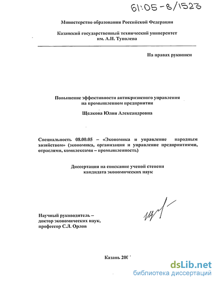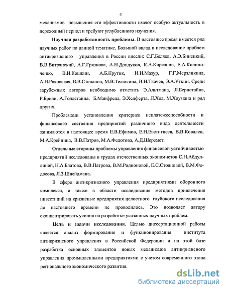 Научная разработанность проблемы. В настоящее время имеется ряд научных работ но данной тематике. Большой вклад в исследование проблем антикризисного управления в России внесли: С.Г.Беляев, Л.Э.Бинецкий, В.В.Витрянский, Л.Г.Грязнова, Л.Н.Дондуков, К.Л.Кирсанов, Е.А.Колини-ченко, В.И.Кошкин, А.Б.Крутик, И.И.Мазур, Г.Г.Мерзликина, А.Н.Ряховская, В.В.Степанов, М.В.Телюкина, В.Н.Ткачев, Э.Л.Уткин. Среди зарубежных авторов необходимо отметить Э.Альтмана, Л.Бернстайна, Р.Брили, А.Голдстайна, Б.Манфреда, Э.Хелферта, Л.Хоа, М.Хоумана и ряд других.