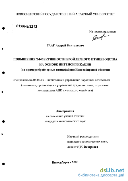 Апробация и реализация результатов исследования. Диссертационная работа выполнена в соответствии с планом научно-исследовательских работ Новосибирского государственного аграрного университета по теме «Повышение экономической эффективности АПК», номер государственной регистрации 01.200.113930. Предложения по повышению экономической эффективности интенсификации бройлерного птицеводства приняты к внедрению в ЗАО «Коченевская птицефабрика» и некоммерческой организации «Союз птицеводов Новосибирской области» в 2004-2006 гг.