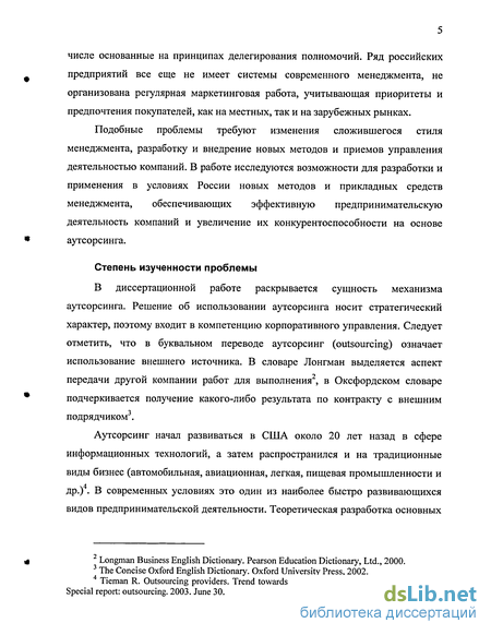 В диссертационной работе раскрывается сущность механизма аутсорсинга. Решение об использовании аутсорсинга носит стратегический характер, поэтому входит в компетенцию корпоративного управления. Следует отметить, что в буквальном переводе аутсорсинг (outsourcing) означает использование внешнего источника. В словаре Лонгман выделяется аспект передачи другой компании работ для выполнения , в Оксфордском словаре подчеркивается получение какого-либо результата по контракту с внешним подрядчиком3.