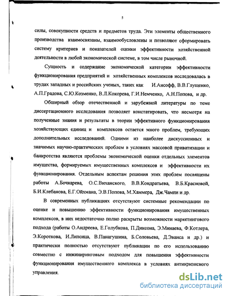 Обширный обзор отечественной и зарубежной литературы по теме диссертационного исследования позволяет констатировать, что несмотря на полученные знания и результаты в теории эффективного функционирования хозяйствующих единиц и комплексов остается много проблем, требующих дополнительных исследований. Одними из наиболее дискуссионных и значимых научно-практических проблем в условиях массовой приватизации и банкротства являются проблемы экономической оценки отдельных элементов имущества, формируемых имущественных комплексов и эффективности их функционирования. Отдельным аспектам решения этих проблем посвящены работы А.Бочкарева, О.С.Виханского, В.В.Кондратьева, В.Б.Красновой, Б.И.Клебанова, Е.Г.Ойхмана, Э.В.Попова, М.Хаммера, Дж.Чампи и др.