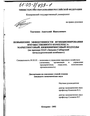 Целью диссертационного исследования является формирование концептуальных основ и путей повышения эффективности функционирования имущественного комплекса в условиях антикризисного управления на основе маркетингового и инжинирингового подходов (на примере ОАО «Западно-Сибирский металлургический комбинат»).
