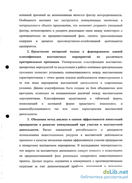 4 концептуального осмысления происходящих изменений в этой быстро прогрессирующей сфере хозяйственной деятельности с целью анализа эффективности инвестирования ресурсов в данное направление развития коммуникативной политики предприятия. Многоаспектность отдачи от позиционирования фирм посредством выставочных мероприятий и анализ эффективности осуществления инвестиций в выставочную сферу, становится предметом все более глубоких исследований данного типа коммуникаций.