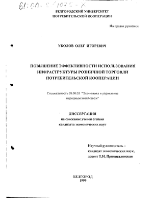 Апробация и внедрение результатов исследования. Содержащиеся в диссертации выводы и предложения по совершенствованию управления инфраструктурой розничной торговли потребительской кооперации и повышению эффективности ее использования внедрены в практику экономической работы организаций системы Белгородского областного союза потребительских обществ (акт внедрения от 16.12.1998 года), Курского областного союза потребительских обществ (акт внедрения от 20.10.1998 года), Прохоровского районного потребительского общества Белгородского облпотребсоюза (акт внедрения от 20.05.1998 года).