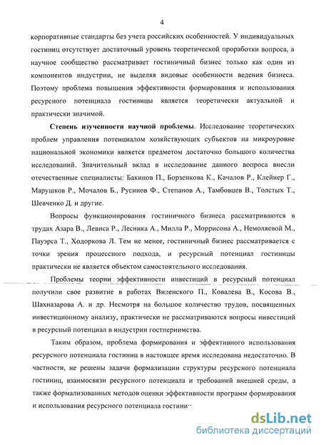 Таким образом, проблема формирования и эффективного использования ресурсного потенциала гостиниц в настоящее время исследована недостаточно. В частности, не решены задачи формализации структуры ресурсного потенциала гостиниц, взаимосвязи ресурсного потенциала и требований внешней среды, а также формализованных методов оценки эффективности программ формирования и использования ресурсного потенциала гостиниц.