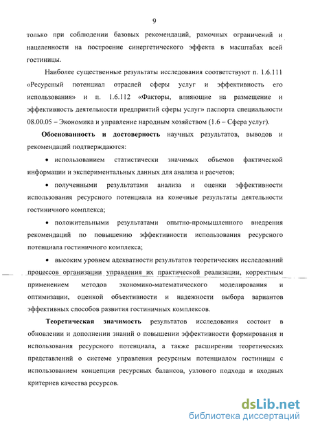 положительными результатами опытно-промышленного внедрения рекомендаций по повышению эффективности использования ресурсного потенциала гостиничного комплекса;
