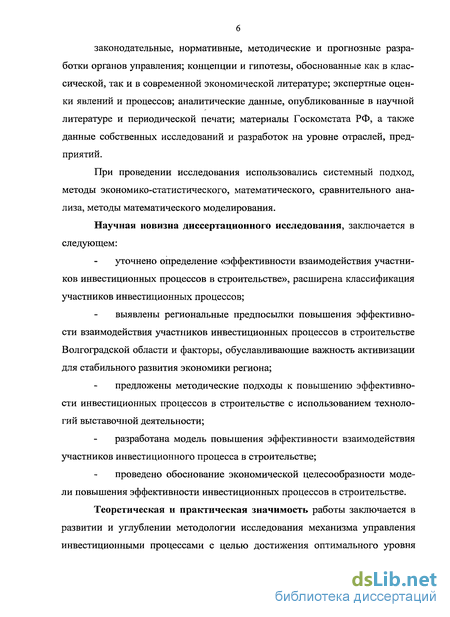 Объектом исследования являются участники инвестиционных процессов в строительстве (предприятия строительного комплекса, государство, муниципалитет, инвесторы, пользователи объектов строительной деятельности, а также выставочные фирмы Волгоградской области).