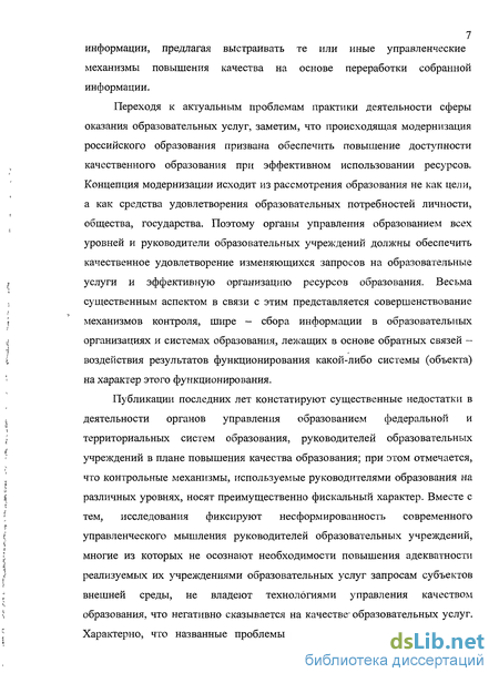 Публикации последних лет констатируют существенные недостатки в деятельности органов управления образованием федеральной и территориальных систем образования, руководителей образовательных учреждений в плане повышения качества образования; при этом отмечается, что контрольные механизмы, используемые руководителями образования на различных уровнях, носят преимущественно фискальный характер. Вместе с тем, исследования фиксируют несформированность современного управленческого мышления руководителей образовательных учреждений, многие из которых не осознают необходимости повышения адекватности реализуемых их учреждениями образовательных услуг запросам субъектов внешней среды, не владеют технологиями управления качеством образования, что негативно сказывается на качестве- образовательных услуг. Характерно, что названные проблемы рассматриваются исследователями