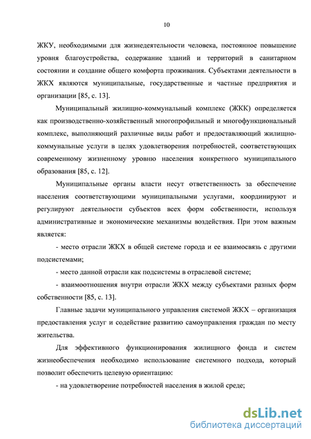 Муниципальный жилищно-коммунальный комплекс (ЖКК) определяется как производственно-хозяйственный многопрофильный и многофункциональный комплекс, выполняющий различные виды работ и предоставляющий жилищно-коммунальные услуги в целях удовлетворения потребностей, соответствующих современному жизненному уровню населения конкретного муниципального образования [85, с. 12]. Муниципальные органы власти несут ответственность за обеспечение населения соответствующими муниципальными услугами, координируют и регулируют деятельности субъектов всех форм собственности, используя административные и экономические механизмы воздействия. При этом важным является: - место отрасли ЖКХ в общей системе города и ее взаимосвязь с другими подсистемами; - место данной отрасли как подсистемы в отраслевой системе; - взаимоотношения внутри отрасли ЖКХ между субъектами разных форм собственности [85, с. 13].
