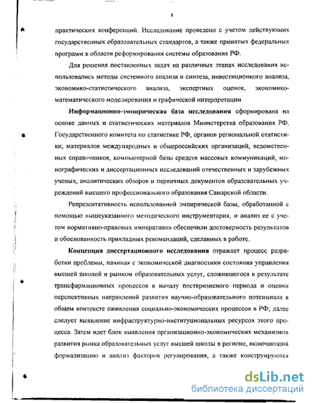 Концепция диссертационного исследования отражает процесс разработки проблемы, начиная с экономической диагностики состояния управления высшей школой и рынком образовательных услуг, сложившегося в результате трансфармационных процессов к началу посткризисного периода и оценки перспективных направлений развития научно-образовательного потенциала в общем контексте оживления социально-экономических процессов в РФ; далее следует выявление инфраструктурно-институциональных ресурсов этого процесса. Затем идет блок выявления организационно-экономических механизмов развития рынка образовательных услуг высшей школы в регионе, включающий формализацию и анализ факторов регулирования, а также конструируются