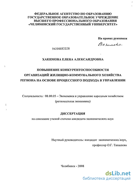 Предметом исследования является совокупность организационно-экономических отношений, возникающих в процессе повышения конкурентоспособности организаций жилищно-коммунального хозяйства региона на основе процессного подхода в управлении.