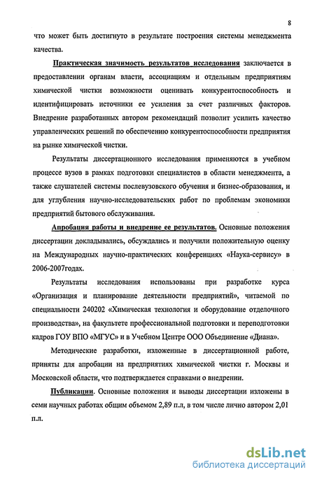 Особенности развития бытового обслуживания, а также отдельные вопросы повышения конкурентоспособности этих предприятий подробно рассмотрены в работах Л.Г. Глязер, Балалова В.Д., Боброва Л.А., Горанина А.И., Гукова Н.В., Марковой В.Д., К.К. Вальтух, В.П. Корчагина, Л.С. Сбытовой, А.Ю. Шарипова, Платоновой Н.А., Сульповара Л.Б, Ядгарова Я.С, Качуриной М.М., Морозова В.Ю, Поповой Р.Ю., Перекалиной Н.С, Корягиной Т.И, Фирсуковой В.В. и др. Несмотря на столь представительные масштаб работ, затрагивающих многие экономические и организационные аспекты становления конкурентных отношений в бытовом обслуживании, вопросы выявления и оценки факторов, формирующих конкурентные преимущества отдельных групп услуг в научной экономической литературе недостаточно проанализированы. Так, требуются дополнительные исследования развития рынка по группам услуг, в частности рынка химической чистки, выявления факторов, существенно влияющих на конкурентоспособность предприятий, обоснование методических подходов к оценке конкурентоспособности предприятий и направлений повышения их конкурентоспособности. Таким образом, актуальность и недостаточная изученность проблемы определили выбор темы диссертационного исследования, ее цели и задачи.