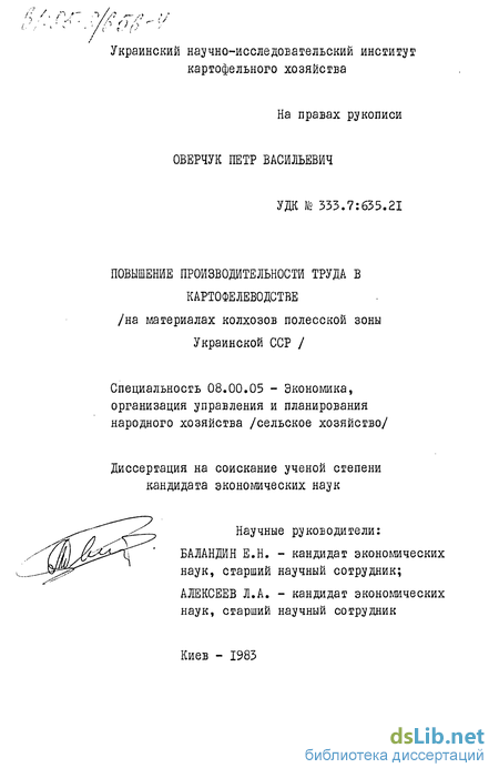 Цель исследования заключается в изучении состояния и разработке конкретных предложений по повышению производительности труда в картофелеводстве колхозов полесской зоны Украинской ССР. Для достижения поставленной цели в диссертационной работе предусматривалось решить следующие задачи: исследовать динамику развития и уровень производительности труда в картофелеводстве; изучить основные производственно-организационные факторы роста производительности труда, определить и количественно измерить степень их влияния на уровень результативного показателя; оценить достигнутый уровень и резервы повышения производительности труда в колхозах с учетом их объективных возможностей в картофелеводстве; разработать экономически обоснованные предложения по повышению производительности труда.