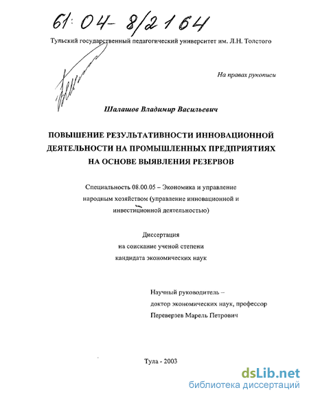 Предметом исследования является процесс управления резервами инновационной деятельности с целью повышения её результативности.