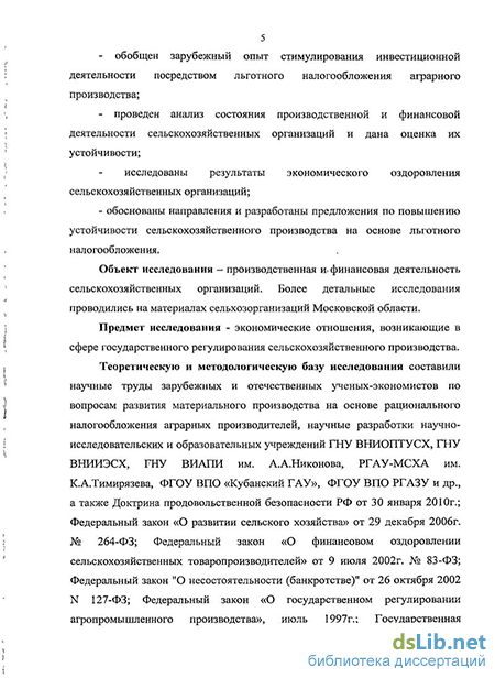 Изучение научных трудов перечисленных и других ученых показало, что проблема устойчивого развития сельскохозяйственного производства в теоретическом и прикладном планах окончательно не решена. Требуют продолжения исследования такие важные аспекты, как влияние действующего налогообложения сельскохозяйственных организаций на их устойчивость, оценка проводимого государством экономического оздоровления аграрного производства. Это предопределило выбор темы диссертационного исследования, его цель и задачи, в процессе которого определены результаты влияния льготного налогообложения на устойчивость сельскохозяйственного производства.