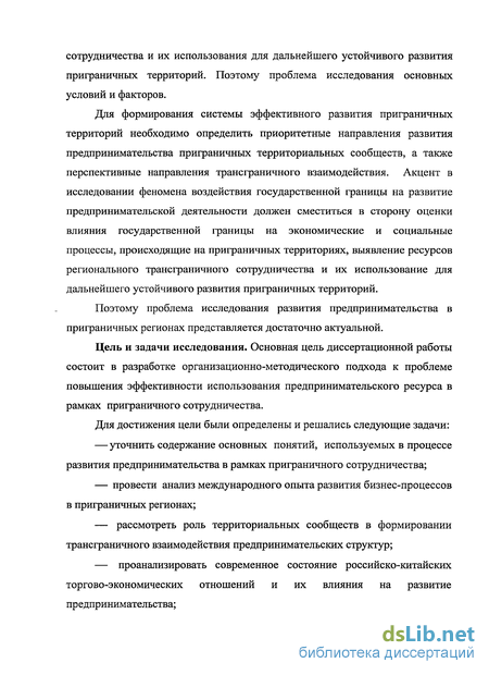 Цель и задачи исследования. Основная цель диссертационной работы состоит в разработке организационно-методического подхода к проблеме повышения эффективности использования предпринимательского ресурса в рамках приграничного сотрудничества.