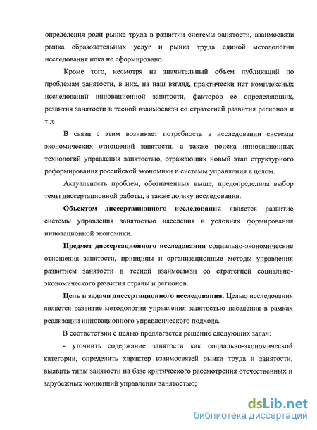 Предмет диссертационного исследования социально-экономические отношения занятости, принципы и организационные методы управления развитием занятости в тесной взаимосвязи со стратегией социально-экономического развития страны и регионов.