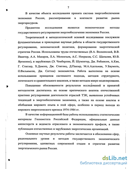 Диссертационное исследование направлено на развитие научной концепции и разработку рекомендаций по совершенствованию основ государственного регулирования энергообеспечения экономики как совокупности теоретико-методологических положений в их системной взаимосвязи с учетом особенностей становления рынка энергоресурсов.