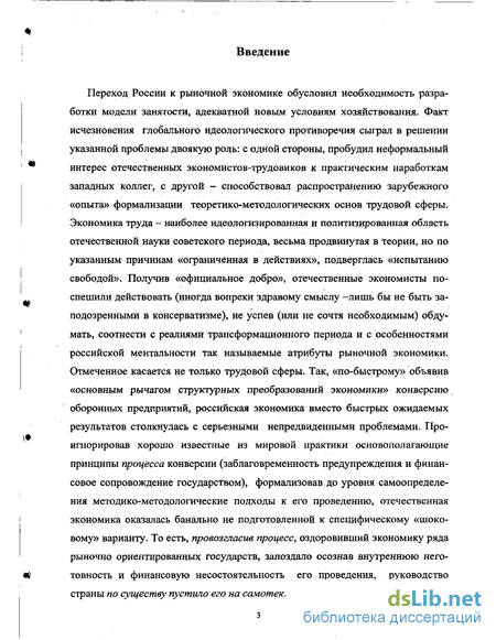 Переход России к рыночной экономике обусловил необходимость разработки модели занятости, адекватной новым условиям хозяйствования. Факт исчезновения глобального идеологического противоречия сыграл в решении указанной проблемы двоякую роль: с одной стороны, пробудил неформальный интерес отечественных экономистов-трудовиков к практическим наработкам западных коллег, с другой — способствовал распространению зарубежного «опыта» формализации теоретико-методологических основ трудовой сферы. Экономика труда — наиболее идеологизированная и политизированная область отечественной науки советского периода, весьма продвинутая в теории, но по указанным причинам «ограниченная в действиях», подверглась «испытанию свободой». Получив «официальное добро», отечественные экономисты поспешили действовать (иногда вопреки здравому смыслу —лишь бы не быть заподозренными в консерватизме), не успев (или не сочтя необходимым) обдумать, соотнести с реалиями трансформационного периода и с особенностями российской ментальности так называемые атрибуты рыночной экономики. Отмеченное касается не только трудовой сферы. Так, «по-быстрому» объявив «основным рычагом структурных преобразований экономики» конверсию оборонных предприятий, российская экономика вместо быстрых ожидаемых результатов столкнулась с серьезными непредвиденными проблемами. Проигнорировав хорошо известные из мировой практики основополагающие принципы процесса конверсии (заблаговременность предупреждения и финансовое сопровождение государством), формализовав до уровня самоопределения методико-методологические подходы к его проведению, отечественная экономика оказалась банально не подготовленной к специфическому «шоковому» варианту. То есть, провозгласив процесс, оздоровивший экономику ряда рыночно ориентированных государств, запоздало осознав внутреннюю неготовность и финансовую несостоятельность его проведения, руководство страны по существу пустило его на самотек.