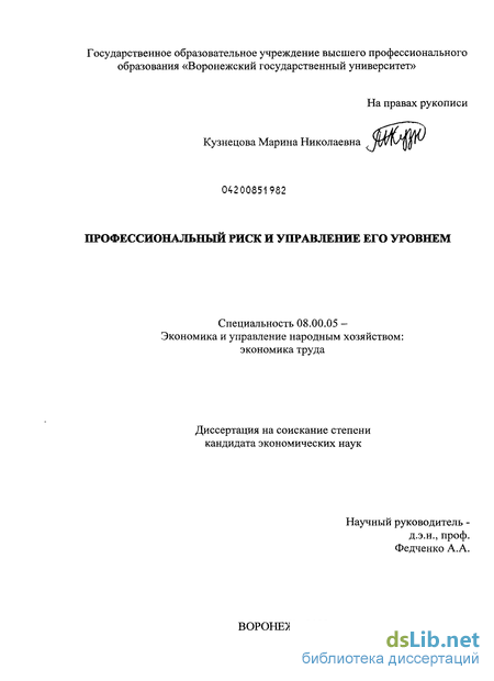 Степень разработанности проблемы. Вопросы, касающиеся условий труда, а также проблемы, связанные с профессиональным риском, постоянно были объектом внимания ученых. Исследованием проблем условий труда занимались следующие российские ученые: СВ. Белов, В.Б. Бычин, И.П. Богомолова, О.И. Волкова, Б.М. Генкин, Ю.Т. Одегов, О.А. Русак, Е.Л. Смирнов, А.А. Федченко, В.Я. Хрипач, Е.В. Шубенкова. Понятие «риск» как категория опасности было рассмотрено у СВ. Белова, Л.К. Исаева, О.Н. Русака. Методологические аспекты исследования проблем возникновения профессиональных рисков на рабочих местах отражены в работах П.А. Долина и Б.П. Ивченко. Определением нормативных показателей, характеризующих влияние факторов производственной среды, занимались Н.Ф. Измеров и А.А. Каспаров. Методы минимизации отрицательного воздействия опасных и вредных факторов были рассмотрены в работах А.А. Жиглявского, В.И. Геминтерна, Ф. Гилла. Предложения по законодательному регулированию профессионального риска содержат работы А.А. Каспарова, Б.П. Ивченко, Л.А. Мартыщенко.