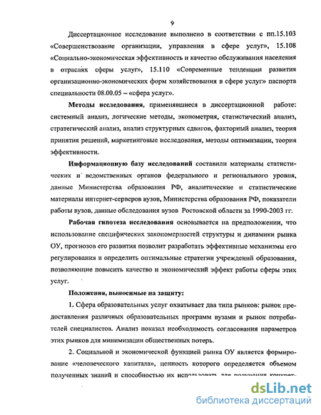 Теоретической и методологической основой диссертационной работы послужили работы по прикладной экономике, маркетингу услуг, экономике, организации и планированию сферы образовательных услуг, стратегическому менеджменту, экономическому анализу и управлению. Диссертационное исследование выполнено в соответствии с пп.15.103 «Совершенствование организации, управления в сфере услуг», 15.108 «Социально-экономическая эффективность и качество обслуживания населения в отраслях сферы услуг», 15.110 «Современные тенденции развития организационно-экономических форм хозяйствования в сфере услуг» паспорта специальности 08.00.05 - «сфера услуг».
