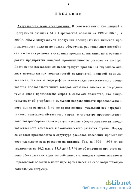 Актуальность темы исследования. В соответствии с Концепцией и Программой развития АПК Саратовской области на 1997-2000гг., к 2000г. объем выпускаемой продукции предприятиями пищевой промышленности должен не только обеспечить рациональные потребности населения региона в основных продуктах питания, но и ориентировать предприятия пищевой промышленности региона на экспорт. Достижение поставленных целей требует проведения глубокого анализа потенциальных возможностей предприятий пищевой промышленности, так как за годы реформ темпы спада отечественного производства продовольственных товаров оказались высоки и опередили темпы спада производства сырья в сельском хозяйстве, что свидетельствует об углублении сырьевой направленности продовольственного рынка региона. В то же время именно удельный вес переработанного сельскохозяйственного сырья в структуре продовольственного товарооборота характеризует степень сформированности продовольственного комплекса и экономического развития страны. Наряду со спадом производства в структуре расходов населения происходит рост удельного веса расходов на питание. Так, за 1990 - 1996 гг. он увеличился на 10,2 п.п. с 35,5 до 45,7 % не обеспечивая при этом научно обоснованных норм потребления, т.е. пищевая промышленность Саратовской области в настоящее время несет на себе возрастающую социальную нагрузку.