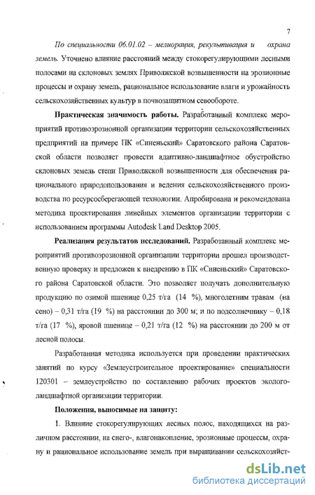 Научная новизна. По специальности 08.00.05 -экономика и управление народным хозяйством (землеустройство). Разработан и внедрен комплекс мероприятий по противоэрозионной организации территории сельскохозяйственного предприятия на агроландшафтной основе. Обоснована необходимость внедрения в степи Приволжской возвышенности адаптивно-ландшафтного землеустройства с применением систем автоматизированного проектирования.