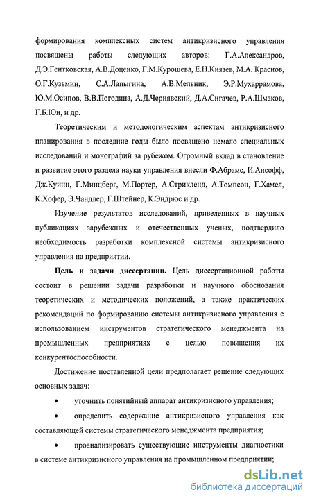 Цель и задачи диссертации. Цель диссертационной работы состоит в решении задачи разработки и научного обоснования теоретических и методических положений, а также практических рекомендаций по формированию системы антикризисного управления с использованием инструментов стратегического менеджмента на промышленных предприятиях с целью повышения их конкурентоспособности.