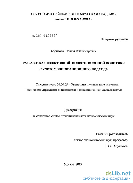 Степень разработанности проблемы. Обоснование механизма формирования инвестиционной политики относится к числу важнейших направлений экономических исследований. Значительный вклад в исследование проблем управления инвестиционной деятельности внесли работы таких ученых, как Багриновский К.А., Бланк И.А., Глазьев С.Ю., Гончаренко Л.П., Дмитриев Я.В., Зубарев А.А., Киперман Г.Я., Колесников В.И., Львов Д.С., Новоселова Л.В., Олейников Е.А., Плотников А.Н., Потемкин В.К., Пузиков О.С., Сенчагов В.К., Слепов В.А., Соколовский В.В., Уринсон Я.М. и др.