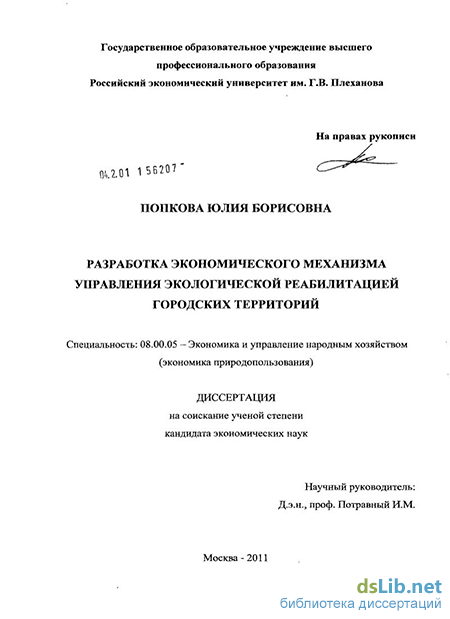В «Концепции долгосрочного социально-экономического развития Российской Федерации на период до 2020 года», утвержденной Распоряжением Правительства Российской Федерации №1662-р от 17.10.2008 г., одним из главных направлений совершенствования механизмов природопользования является ликвидация накопленного загрязнения и восстановление захламленных земель. В то же время вопросы экономического регулирования экологической реабилитации городских земель, совершенствования организационно-экономических механизмов финансирования и реализации природоохранной деятельности на урбанизированных территориях не решены и требуют своего научного обоснования.