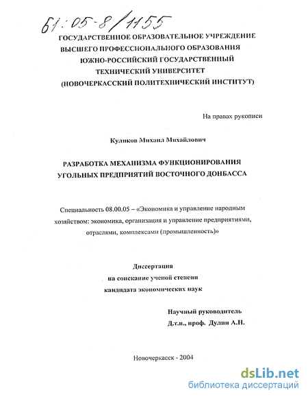 Объект и предмет исследования. Объектом диссертационного исследования являются угольные предприятия Восточного Донбасса. Предметом выступают управленческие отношения, возникающие в процессе разработки механизма функционирования угольных предприятий Восточного Донбасса.