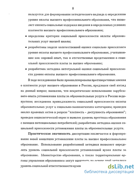 Диссертационная работа посвящена разработке методики определения социальной приемлемости платы за обучение в учреждениях высшего профессионального образования.