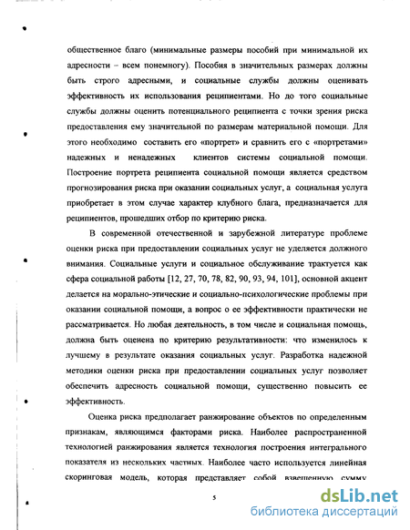 Таким образом, в диссертационном исследовании на основе анализа эффективности системы социальной помощи, постановки проблемы ее адресности, введения понятия «риск при оказании социальной услуги» разрабатываются методы и средства оценки и прогнозирования этого риска на основе современных информационных технологий.