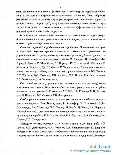 Степень научной разработанности проблемы. Проведенное автором исследование научных трудов показало, что концепция стратегического управления имеет серьезную научную основу. Среди зарубежных ученых заслуженным авторитетом пользуются работы Р. Акоффа, И. Ансоффа, Дж. Барни, Р. Гранта, Г. Минцберга, М. Портера, К. Прахалада, Ф. Селзника, Г. Хамела, А. Чандлера, Дж. Штайнера, К. Эндрюса и др. Среди отечественных ученых вклад в разработку стратегического управления внесли В.Р. Веснин, В.С. Ефремов, В.С. Катькало, Г.Б. Клейнер, С.А. Попов, Р.А. Фатхутдинов, Г.В. Федоришин, И.А. Ханыков.