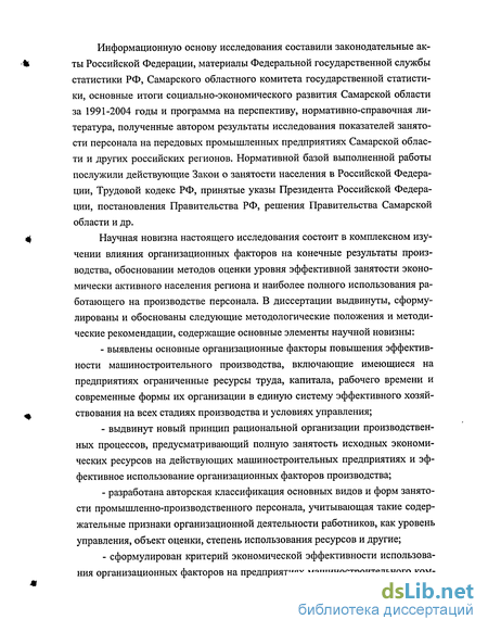 Информационную основу исследования составили законодательные акты Российской Федерации, материалы Федеральной государственной службы статистики РФ, Самарского областного комитета государственной статистики, основные итоги социально-экономического развития Самарской области за 1991-2004 годы и программа на перспективу, нормативно-справочная литература, полученные автором результаты исследования показателей занятости персонала на передовых промышленных предприятиях Самарской области и других российских регионов. Нормативной базой выполненной работы послужили действующие Закон о занятости населения в Российской Федерации, Трудовой кодекс РФ, принятые указы Президента Российской Федерации, постановления Правительства РФ, решения Правительства Самарской области и др.