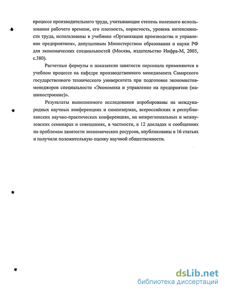 Расчетные формулы и показатели занятости персонала применяются в учебном процессе на кафедре производственного менеджмента Самарского государственного технического университета при подготовке экономистов-менеджеров специальности «Экономика и управление на предприятии (машиностроение)».