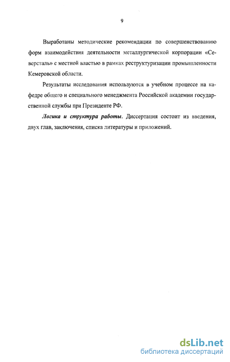 Выработаны методические рекомендации по совершенствованию форм взаимодействия деятельности металлургической корпорации «Северсталь» с местной властью в рамках реструктуризации промышленности Кемеровской области.