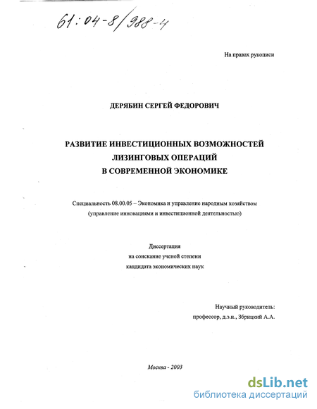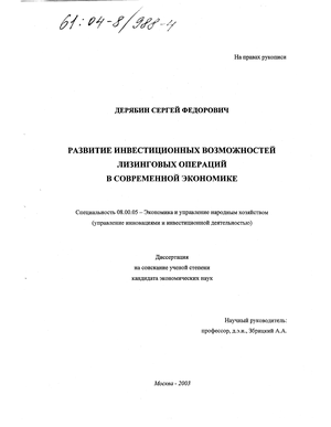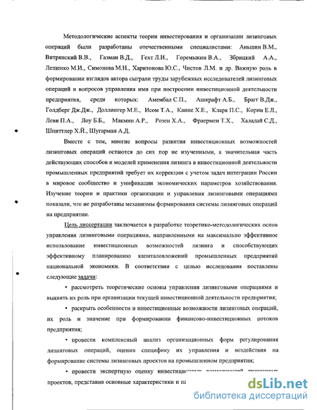 Предмет исследования: система организационно-экономических отношений между хозяйствующими субъектами, участвующими в процессе управления инвестиционной деятельностью на основе лизинга, направленной на рациональное повышение инвестиционного потенциала предприятий и основанная на лизинге.