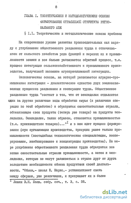 Экономическая основа, на которой развивается аграрно-про-мышленная интеграция - диалектическое единство двух взаимосвязанных процессов разделения и кооперации труда. Общественное разделение труда "состоит в том, что от земледелия отделяются один за другим различные виды обработки сырья (и различные операции по этой обработке) и образуются самостоятельные отрасли, обменивающие свои продукты (теперь уже товары) на продукты земледелия. Земледелие, таким образом, становится промышленностью (т.е. производством товаров)... и в нем идет процесс формирования форм организации производства, присущих ранее только промышленности (постадийная технологическая специализация, кооперирование, комбинирование и концентрация производства). По мере углубления общественного разделения труда образуются все новые самостоятельные отрасли промышленности, а затем и земледелия, которые не могут развиваться в отрыве друг от друга вследствие необходимости обмена продуктами своей деятельности. "Обмен,- писал К. Маркс,- устанавливает связь между сферами, уже различными, и превращает их в более 1 Ленин В.И. Полн. собр. соч., т. 3, с. 58. или менее зависимые друг от друга отрасли совокупного общест т венного производства" . Проявление этой зависимости отражается в наличии широкой сети межотраслевых производственных связей. Создаются, как говорил К.Маркс, "... материальные предпосылки нового, высшего синтеза - союза земледелия и промыш ленности на основе их противоположно развившихся форм" , а переход от простых связей сельского хозяйства и промышленности к регулируемым договорным связям означает начало реализации этих предпосылок и возникновение простейших форі агропромышленной интеграции.