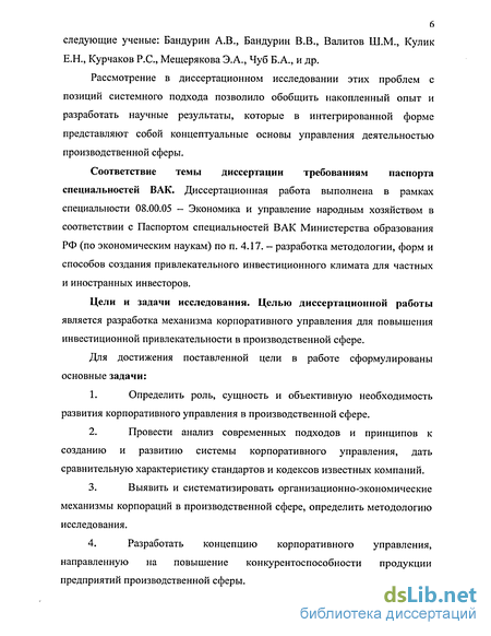 Цели и задачи исследования. Целью диссертационной работы является разработка механизма корпоративного управления для повышения инвестиционной привлекательности в производственной сфере.