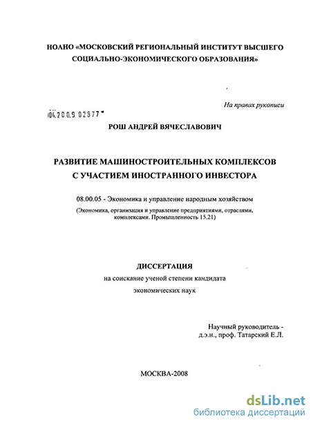 определены методы анализа влияния иностранного капитала и выявлены направления экономической политики защиты российских интересов от негативного воздействия иностранных инвесторов на развитие машиностроительных комплексов;