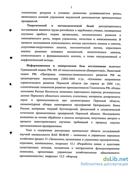 Информационная и эмпирическая база исследования включает Гражданский кодекс РФ, ФЗ «О несостоятельности (банкротстве)», Налоговый кодекс РФ; «Программу социально-экономического развития РФ на среднесрочную перспективу (2003-2005 гг.)», «Основные направления стратегического развития Пермской области (на период до 2006 г.)», статистические показатели развития промышленности Госкомстата РФ, обзоры экономики России Института экономики переходного периода; региональные данные Пермского областного комитета статистики; материалы департамента науки и промышленности при администрации Пермской области, конъюнктурные обзоры мониторингов предприятий Центрального банка России; материалы текущей бухгалтерской, финансовой и статистической отчетности промышленных предприятий Пермской области. Исследование выполнено на основе обработки и анализа материалов, полученных автором в процессе мониторингового изучения требований к процессу закупок промышленными предприятиями.