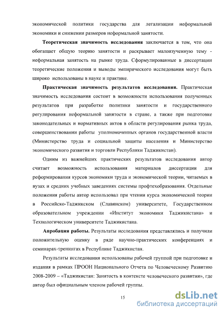 По мнению диссертанта, невозможно понять современный Таджикистан без пристального внимания к неформальной занятости. Поэтому в работе рассмотрены специфика, масштаб, качественный состав и структуры неформальной занятости в Республики Таджикистан. Особое место отведено проблеме устойчивости масштабов неформальной занятости, которая связана со специфическим спросом на существующем рынке труда. Выборочные обследования, проведенные в стране, показали, что неформальная занятость концентрируется на частных микропредприятиях, действующих в основном в сфере торговли, услуг, а также в строительстве. Именно эти сферы сталкиваются с серьезными колебаниями спроса и нуждаются в процессе гибкого регулирования численности занятых, который может обеспечить только незарегистрированная занятость.