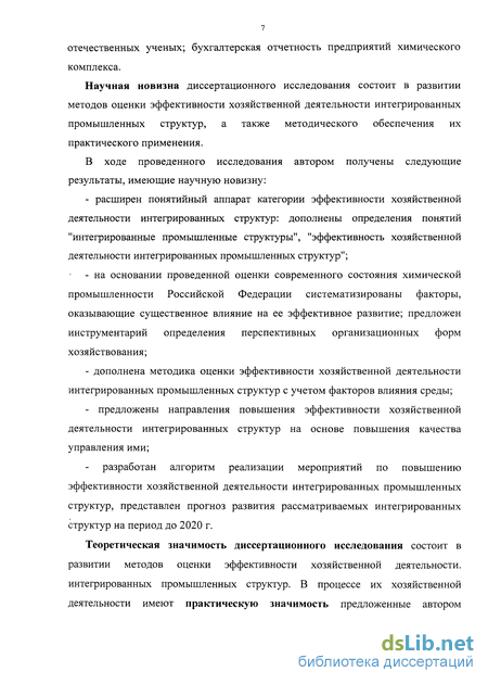 Научная новизна диссертационного исследования состоит в развитии методов оценки эффективности хозяйственной деятельности интегрированных промышленных структур, а также методического обеспечения их практического применения.