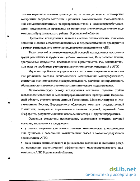 Основные результаты исследования, содержащие элементы научной новизны, заключается в следующем: уточнены теоретические основы развития экономических взаимоотношений, сущность и содержание хозяйственных связей в молочнопродуктовом подкомплексе АПК; дана оценка экономического и финансового состояния и выявлены резервы повышения экономической эффективности молочнопродуктового подкомплекса АПК Воронежской области; разработана и предложена концептуальная схема формирования прямых хозяйственных связей в молочнопродуктовом подкомплексе регионального АПК; определены оптимальные параметры интегрированного объединения «Бутурлиновкамолоко»; обоснованы основные направления государственного регулирования экономических взаимоотношений в молочнопродуктовом подкомплексе АПК.