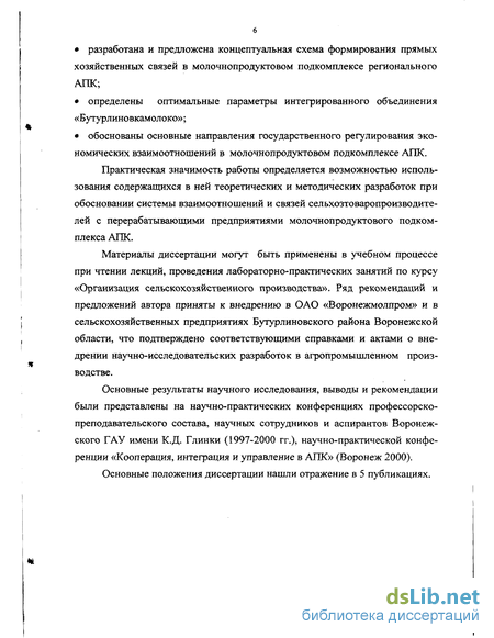 Материалы диссертации могут быть применены в учебном процессе при чтении лекций, проведения лабораторно-практических занятий по курсу «Организация сельскохозяйственного производства». Ряд рекомендаций и предложений автора приняты к внедрению в ОАО «Воронежмолпром» и в сельскохозяйственных предприятиях Бутурлиновского района Воронежской области, что подтверждено соответствующими справками и актами о внедрении научно-исследовательских разработок в агропромышленном производстве.