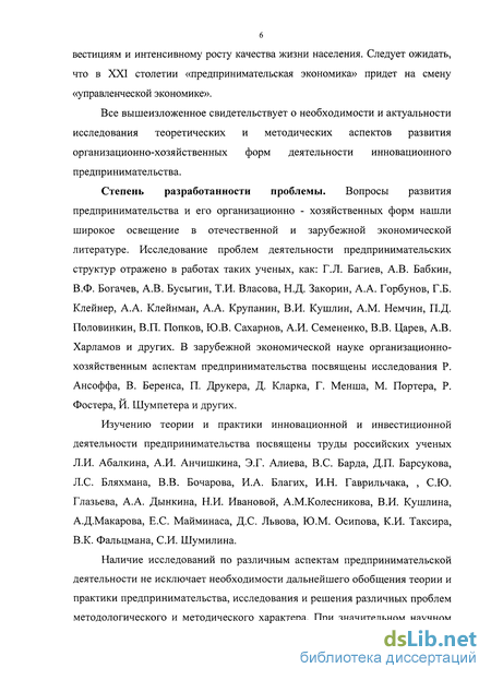 Степень разработанности проблемы. Вопросы развития предпринимательства и его организационно-хозяйственных форм нашли широкое освещение в отечественной и зарубежной экономической литературе. Исследование проблем деятельности предпринимательских структур отражено в работах таких ученых, как: Г.Л. Багиев, А.В. Бабкин, В.Ф. Богачев, А.В. Бусыгин, Т.И. Власова, А.А. Горбунов, Н.Д. Закорин, Г.Б. Клейнер, А.А. Клейман, О.Д. Коль, А.А. Крупанин, В.И. Кушлин, А.М. Немчин, П.Д. Половинкин, В.П. Попков, Ю.В. Сахарнов, А.И. Семененко, В.В. Царев, А.В. Харламов и других. В зарубежной экономической науке организационно-хозяйственным аспектам предпринимательства посвящены исследования Р. Ансоффа, В. Беренса, П. Друкера, Д. Кларка, Г. Менша, М. Портера, Р. Фостера, Й. Шумпетера и других.