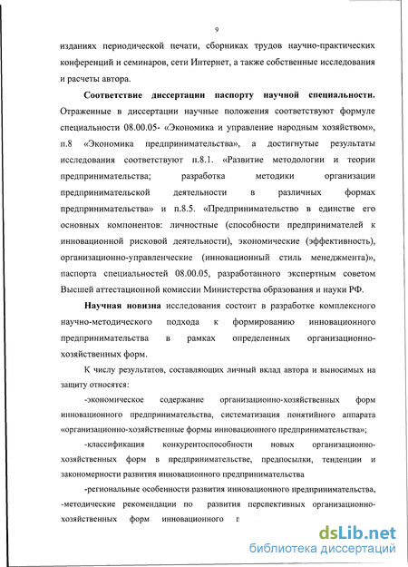 Отраженные в диссертации научные положения соответствуют формуле специальности 08.00.05- «Экономика и управление народным хозяйством», п.8 «Экономика предпринимательства», а достигнутые результаты исследования соответствуют п.8.1. «Развитие методологии и теории предпринимательства; разработка методики организации предпринимательской деятельности в различных формах предпринимательства» и п.8.5. «Предпринимательство в единстве его основных компонентов: личностные (способности предпринимателей к инновационной рисковой деятельности), экономические (эффективность), организационно-управленческие (инновационный стиль менеджмента)», паспорта специальностей 08.00.05, разработанного экспертным советом Высшей аттестационной комиссии Министерства образования и науки РФ.