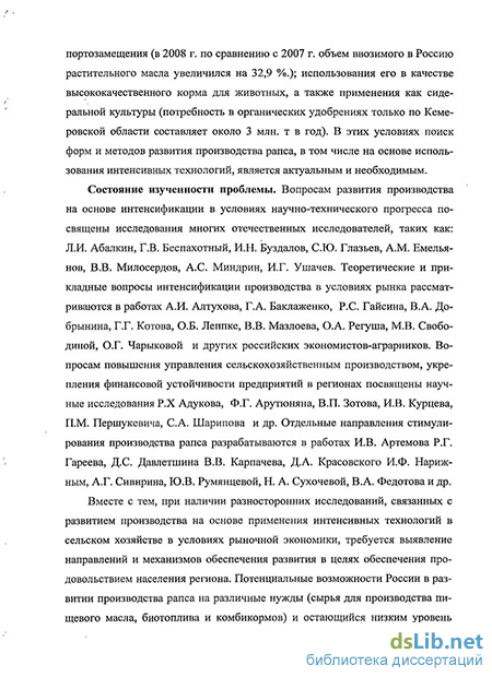 Состояние изученности проблемы. Вопросам развития производства на основе интенсификации в условиях научно-технического прогресса посвящены исследования многих отечественных исследователей, таких как: Л.И. Абалкин, Г.В. Беспахотный, И.Н. Буздалов, СЮ. Глазьев, A.M. Емельянов, В.В. Милосердов, А.С. Миндрин, И.Г. Ушачев. Теоретические и прикладные вопросы интенсификации производства в условиях рынка рассматриваются в работах А.И. Алтухова, Г.А. Баклаженко, Р.С. Гайсина, В.А. Добрынина, Г.Г. Котова, О.Б. Легшке, В.В. Мазлоева, О.А. Регуша, М.В. Свобо-диной, О.Г. Чарыковой и других российских экономистов-аграрников. Вопросам повышения управления сельскохозяйственным производством, укрепления финансовой устойчивости предприятий в регионах посвящены научные исследования Р.Х Адукова, Ф.Г. Арутюняна, В.П. Зотова, И.В. Курцева, П.М. Першукевича, С.А. Шарипова и др. Отдельные направления стимулирования производства рапса разрабатываются в работах И.В. Артемова Р.Г. Гареева, Д.С. Давлетшина В.В. Карпачева, Д.А. Красовского И.Ф. Нариж-ным, А.Г. Сивирина, Ю.В. Румянцевой, Н. А. Сухочевой, В.А. Федотова и др.